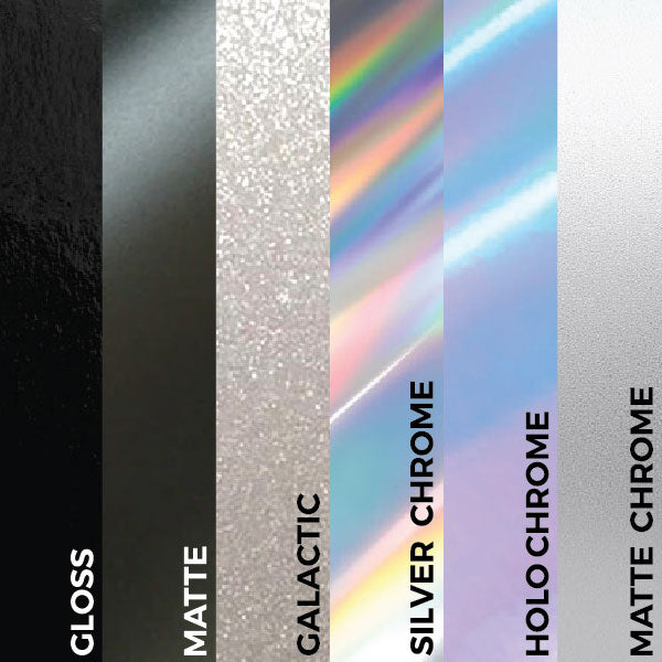 Choose your finish with standard gloss or upgrade to matte, galactic, silver chrome or holographic chrome.